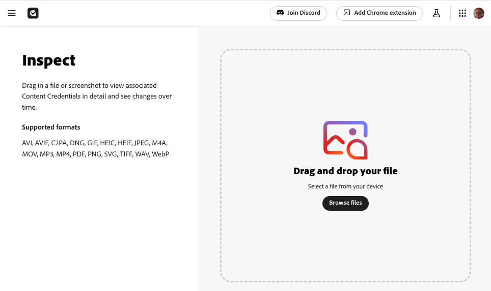 Click Select a file from your device then use the native picker or drag and drop a file to upload it and display information from the associated Content Credentials (if any) such as the author, the tools used to create the asset, and so on.